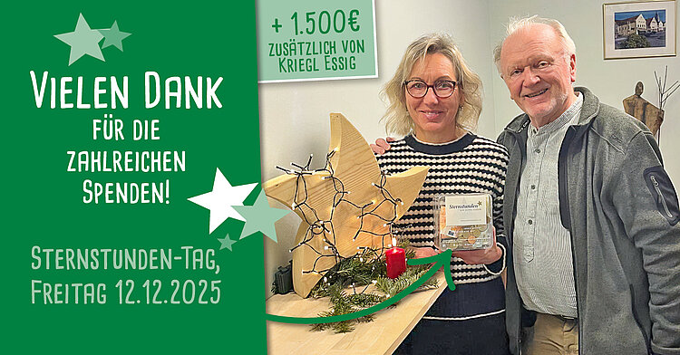 Dank unseren Mitarbeitern und unseren treuen Kunden konnten wir mit der Sternstunden-Box wieder fleißig Spenden sammeln. Somit kann auch dieses Jahr wieder ein schöner Betrag – der von Kriegl Essig zusätzlich um EUR 1.500 aufgestockt wurde – an das Projekt Sternstunden überreicht werden.