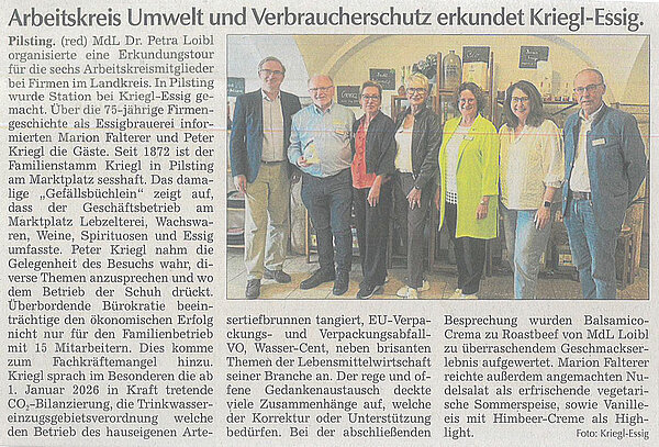 Auch bei der Essigmanufaktur Kriegl wurde Station gemacht. Hierzu resümierte AK-Vorsitzender Flierl: "Die Bereisung war aufschlussreich und inspirierend. Sie zeigte, dass bayerische Unternehmen Verantwortung übernehmen – ökologisch, wirtschaftlich, zukunftsorientiert."